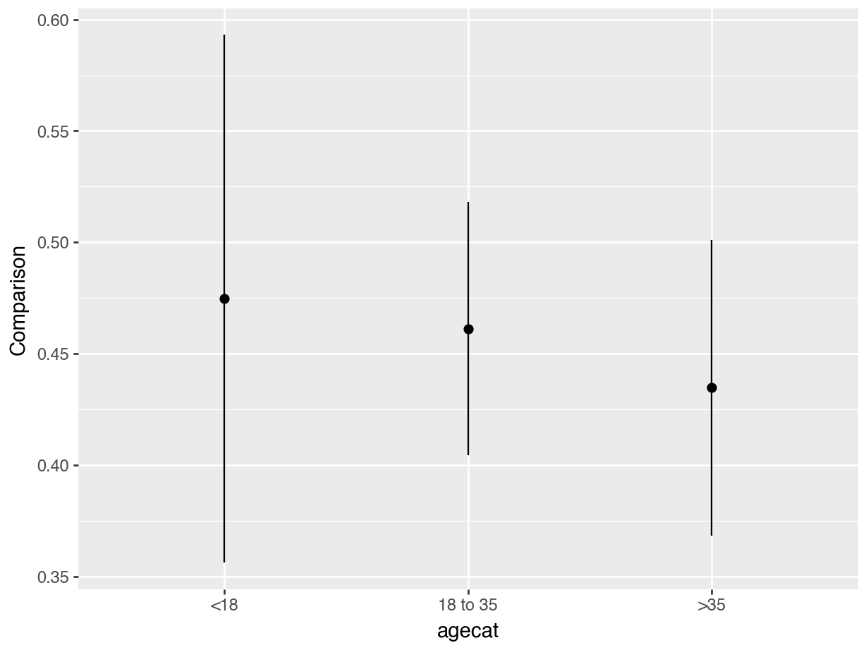 We already know that the avg_comparisons() function can be used to compute average counterfactual comparisons, or conditional average treatment effects by subgroups of the data. For example, it allows us to calculate the average change in predicted outcome associated with a change in incentive, for different age subgroups.