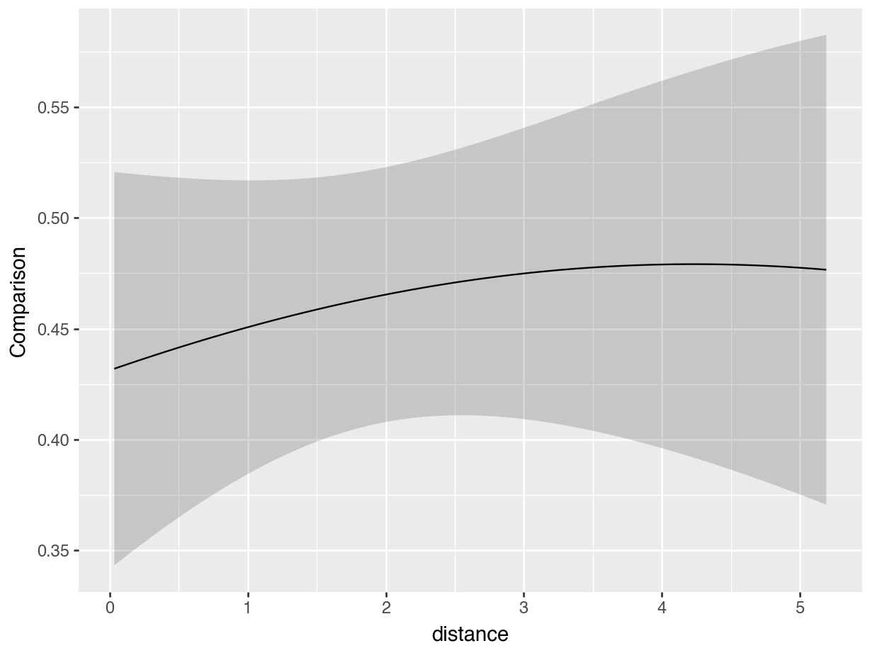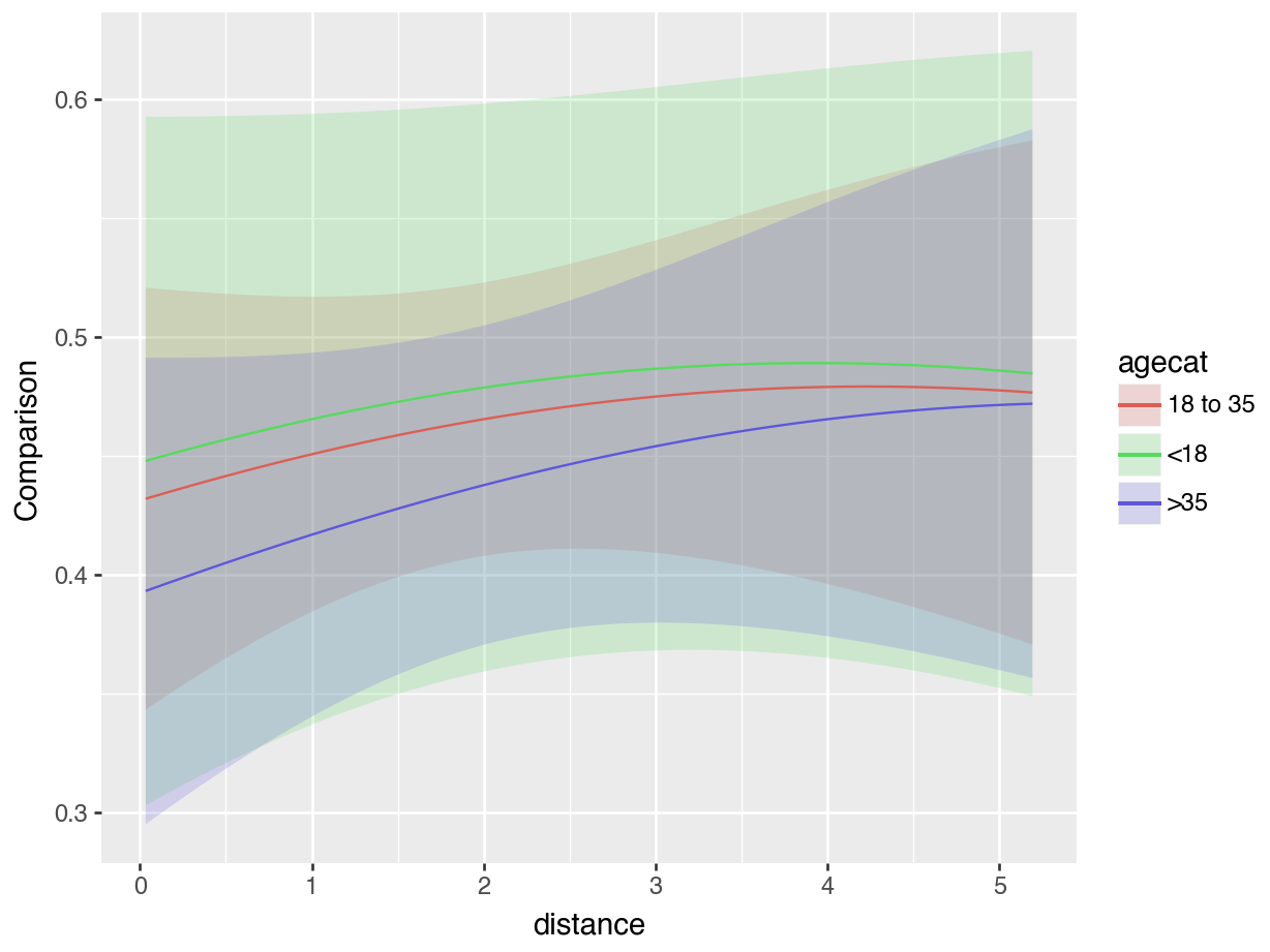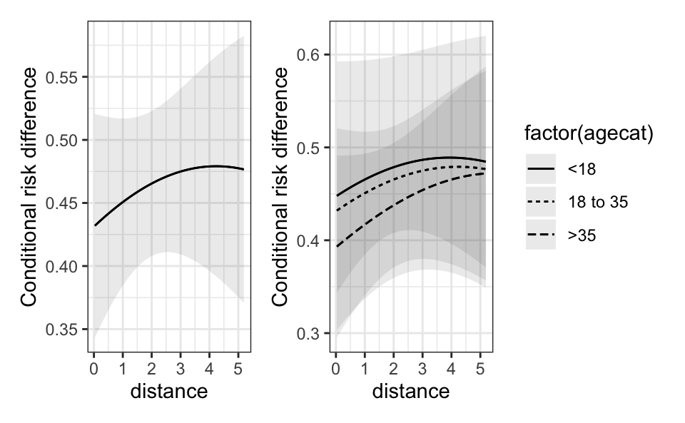 The first plot shows that the estimated effect of incentive on the predicted probability of outcome is smaller for individuals living closest to the test center. The second plot further indicates slight differences across age groups, with older participants reacting less strongly to the treatment. Chapter 10 shows how to explore these kinds of contrasts more formally; it shows how to design and interpret tests of treatment effect heterogeneity, using interactions and polynomials.