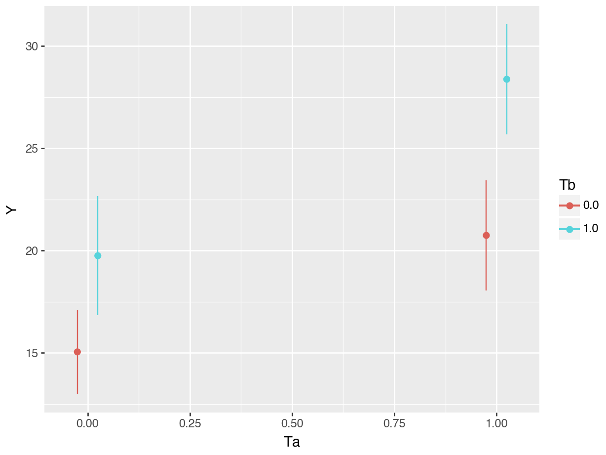 The estimated effect of \(T_a\) on \(Y\) is equal to 5.69 when \(T_b=0\), but equal to 8.62 when \(T_b=1\). At first glance, it thus seems that the effect of \(T_a\) is stronger when \(T_b=1\).