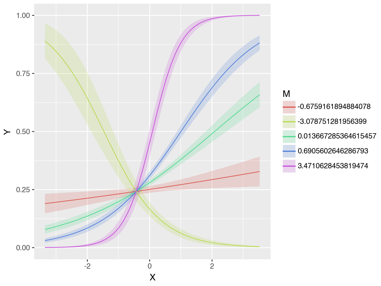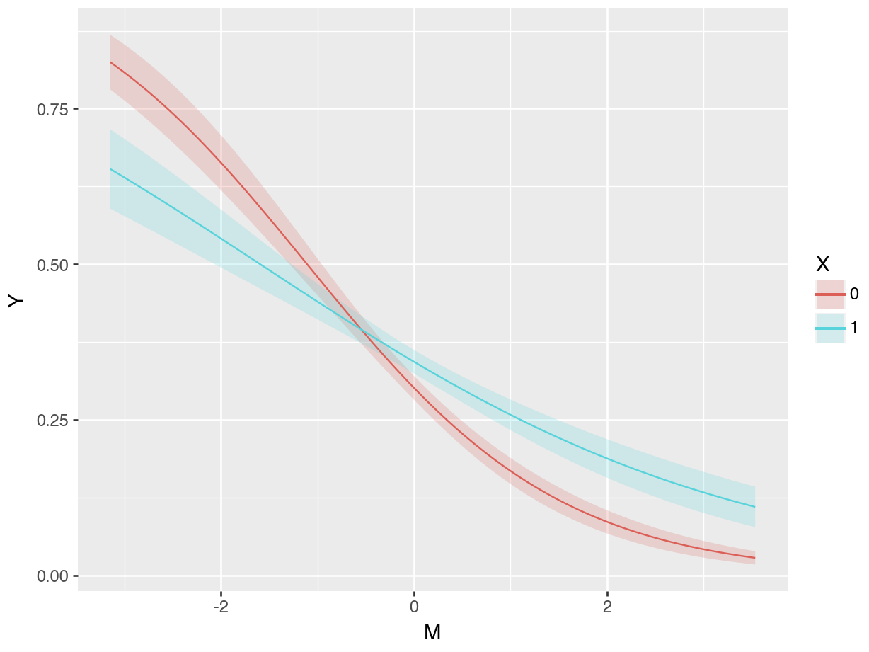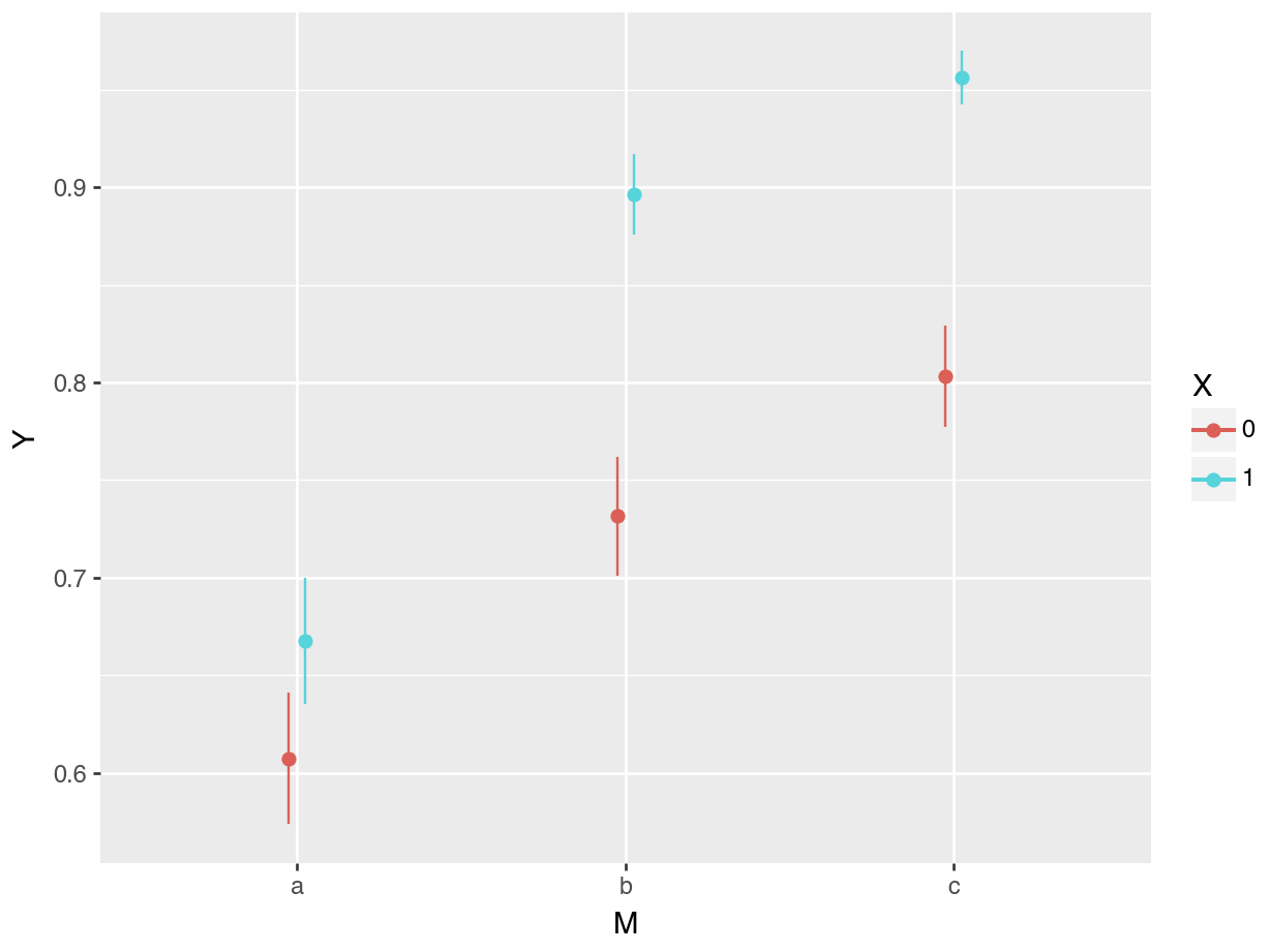 avg_predictions(mod, by = c("X", "M"))| X | M | Estimate | Std. Error | z | Pr(>|z|) | 2.5 % | 97.5 % |