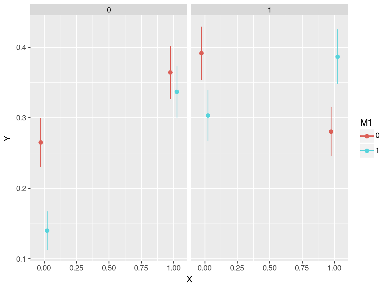 The triangles in this figure are systematically above the corresponding circles. On average, the predicted probability that \(Y=1\) is considerably higher when \(X=1\) than when \(X=0\). Figure 10.1 also gives us a first hint that the relationship between \(X\) and \(Y\) may differ across values of \(M\). For some values of \(M\), the triangles are farther apart from the circles, suggesting that the effect of \(X\) on \(Y\) may be stronger when \(M\) takes on those values.
