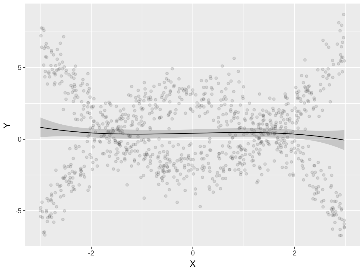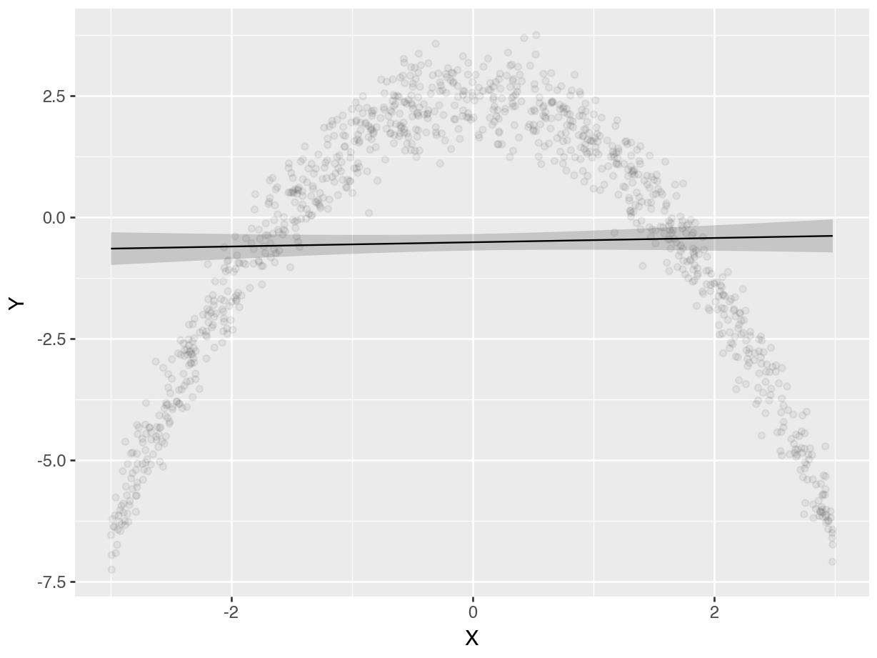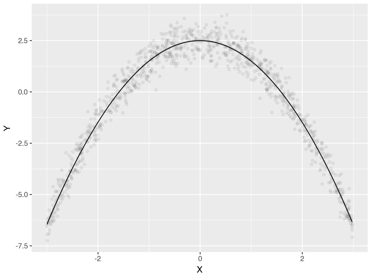 \[\begin{align*} Y = 2.5 - X^2 + \varepsilon, && \text{where }\varepsilon\sim N(0,1) \text{ and } X\sim U(-3,3) \end{align*}\]