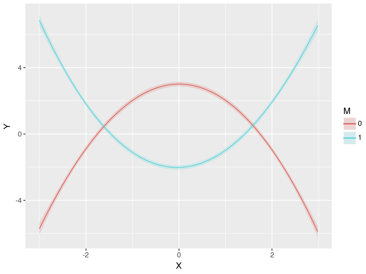 \[\begin{align*} Y = 2.5 - X^2 - 5 \cdot M + 2 \cdot M \cdot X^2 + \varepsilon && \text{where }\varepsilon\sim N(0,1) \text{ and } X\sim U(-3,3) \end{align*}\]